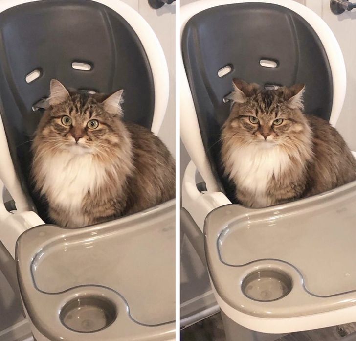 19. My cat’s face before and after my wife told her that the high chair wasn’t for her