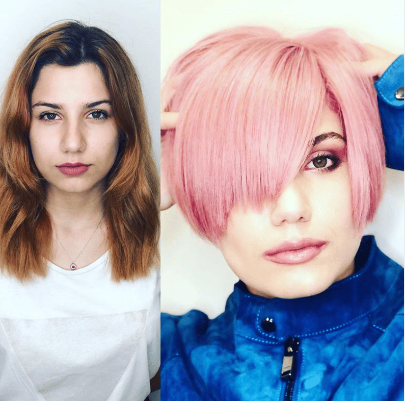 Talk about a big change here. Not only did this woman go for an asymmetrical pixie cut, she took it one step further by dyeing her hair pink. I think I’m in love with this look.