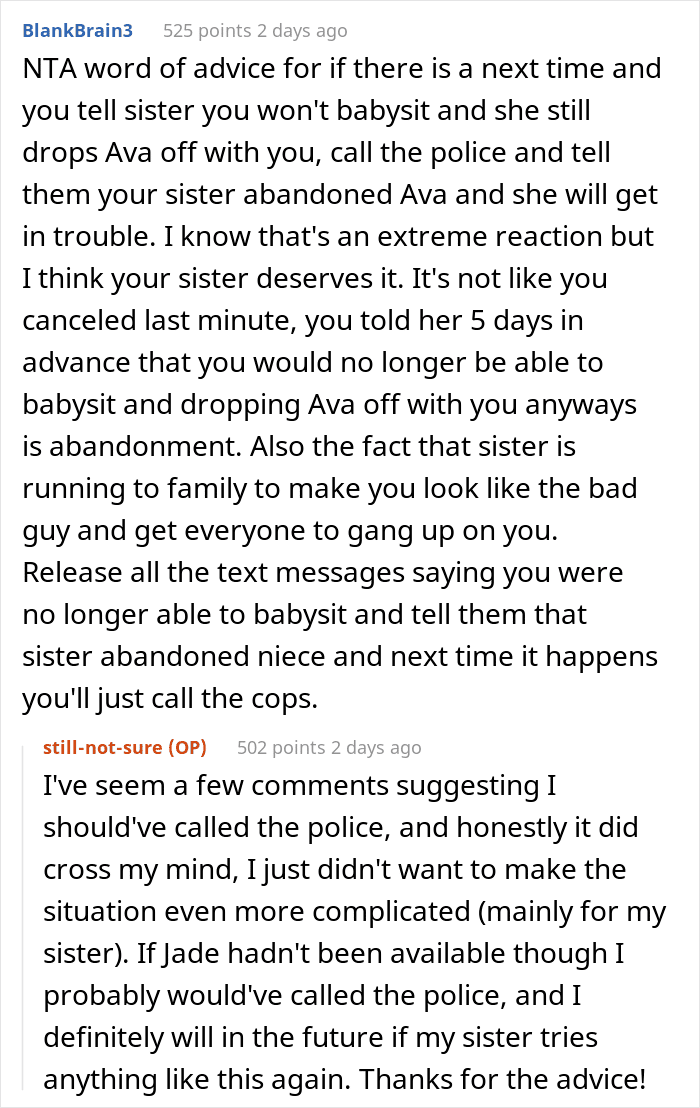 She told them five days before their anniversary that she won’t be able to babysit for them because she has other plans and that they should find another arrangement because she won’t be available to do so. Because her sister didn’t respond, OP assumed that everything would be fine for her, but on the day that she needed to leave the house, her sister came and dropped Ava off without listening to OP’s instructions. After getting in the car, she quickly drove off. OP attempted to give her a call but her phone was turned off. The only other choice for OP was to entrust Ava to the care of an unknown person. This was the point at which the drama in the family began. You’ll find it if you scroll down.