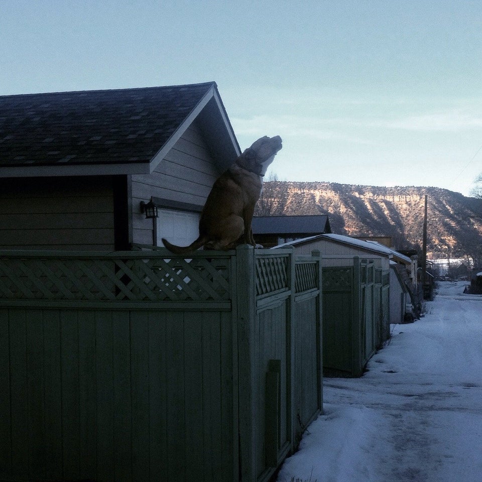 Another stunt on the fence. Seems he is howling for his accomplishment.