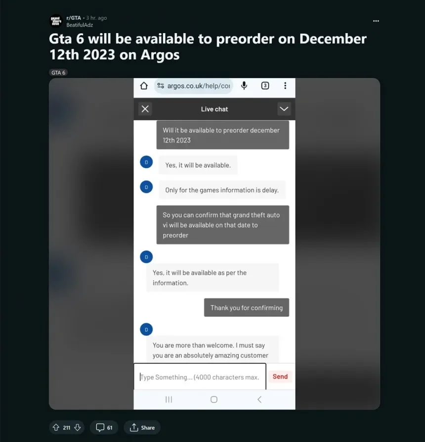 A recent incident highlights this concern. A user on Reddit claimed that GTA 6 preorders would start from December 12, 2023, at Argos, a UK retail chain. They even posted a screenshot of an alleged conversation with an Argos employee confirming this information. However, upon further investigation, including direct inquiries with Argos employees, it became clear that this claim was false.