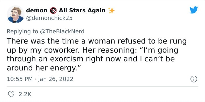“I think it could be both. There are harmless people who have weird personality quirks or are tired or some such thing and they will definitely say something weird that’ll stick with you. On the other hand, there are people who have some inherent anger or sadness that they’ve decided to take out on other people and that other person is usually an employee getting paid minimum wage and can’t possibly fight back.”
