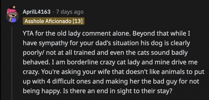 When the OP agreed to take in animals, he showed how little he cared about his wife. She can only feel sorry for his dad for so long before her true feelings come out.