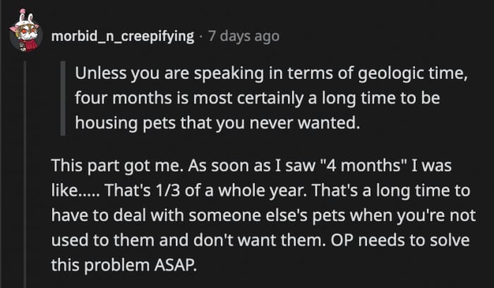 This was supposed to be a short-term solution, but they ended up taking care of the animals for four months. OP said that the cats and dogs changed his wife into a different person.