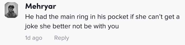 Another person wrote that the man had the genuine ring in his back pocket and claimed: “He had the main ring in his pocket if she can’t get a joke she better not be with you.”