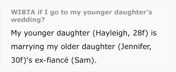 The woman shared that she tried talking to her older daughter, asking her to forgive and move on, as this whole situation is ripping their family apart. It is getting harder for the mother to support both of her daughters because of the circumstances. She asked people online if she should go to her daughter’s wedding because it would hurt her other daughter’s feelings.