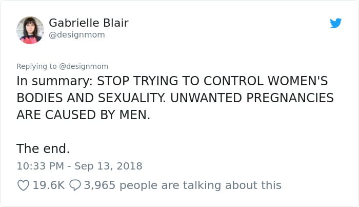 Author Gabrielle Blair from California turned to Twitter to argue that unplanned pregnancies are always the man’s fault