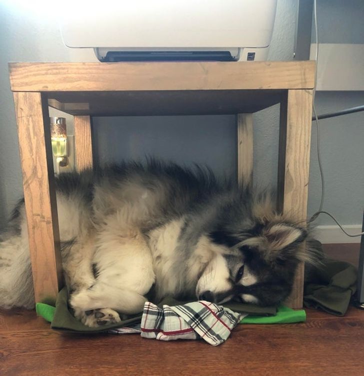 “My dog insists on cramming himself into small places and under things so we made a make-shift bed for under our printer.”