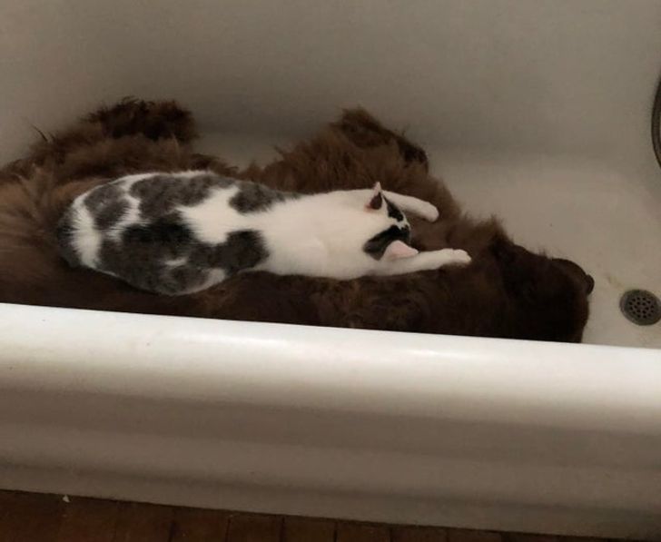 “My dog loves laying in the bathtub, and my cat loves laying on my dog.”