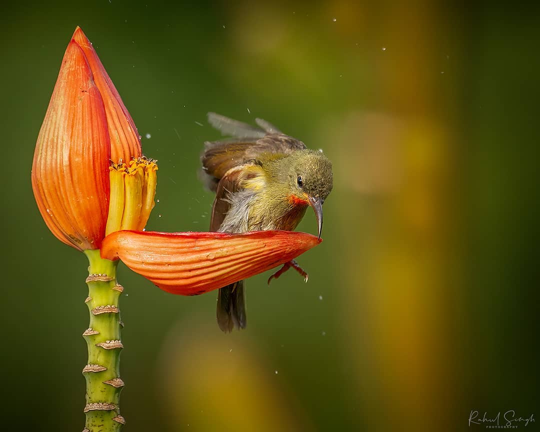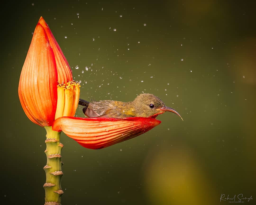 This is a little shoutout to a talented wildlife photographer, Rahul Singh who has clicked some really stunning wildlife pictures. Like rhinos, elephants, monkeys, deers, and other animals. And this time, he has amazed us with his once-in-a-lifetime capture of a tiny bird using flower petals as her bathtub. That sounds so adorable.
