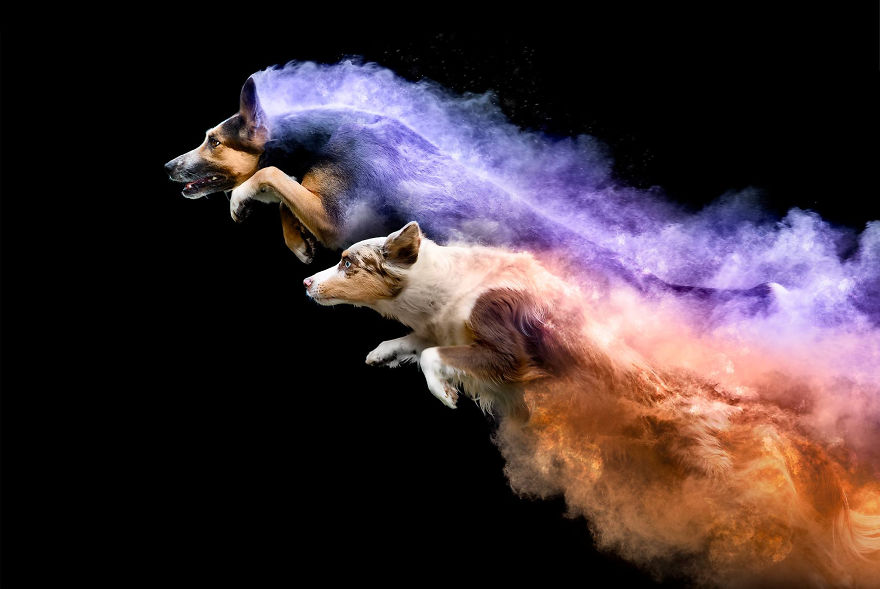 I powdered some paint on the cute doggos with an attempt to experiment with this new technique. Surprisingly, the results came out pretty amazing. Since the dynamic swirls and color explosion was captured in real-time and on location, the pictures look so surreal. Each of the images is different and unique. It clearly shows the difference between each dog breed and how their body shapes move. I can say that the power paint acts as a perfect action amplification device.