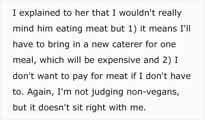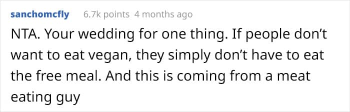 A vegan bride to be posted before her wedding to make it clear to her guests that the menu at the wedding will be vegan. However, one of her uncles refused to agree to the situation and forced that according to traditions the wedding should have meat on the menu. The drama at the wedding escalated a bit more than what the bride had expected. So, she decided to ask people whether it was right or wrong for her uncle to raise such a demand.